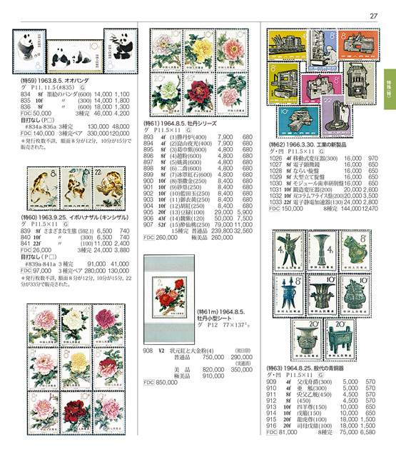 2026年版では、2025年10月までに発行された 一番切手から1990年初めまで 広い範囲で 「新中国切手カタログ」最新版では、幅広い範囲で評価を見直しています。中国切手では最初に発行された編号(切手に付けられた整理記号)「紀念」 時期(1949 年)から編号 「J/T」時期(1991 年末)までの切手で、隔年採録の中国マカオ切手ではすべての切手について、中国における評価や為替/市場の動向に基づいた評価改訂を実施しています